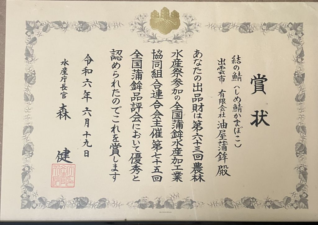 令和6年度に行われた全国蒲鉾品評会にて水産庁長官賞をいただきました。